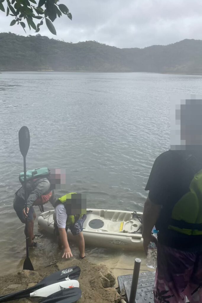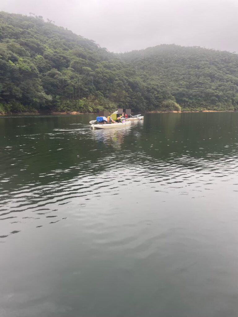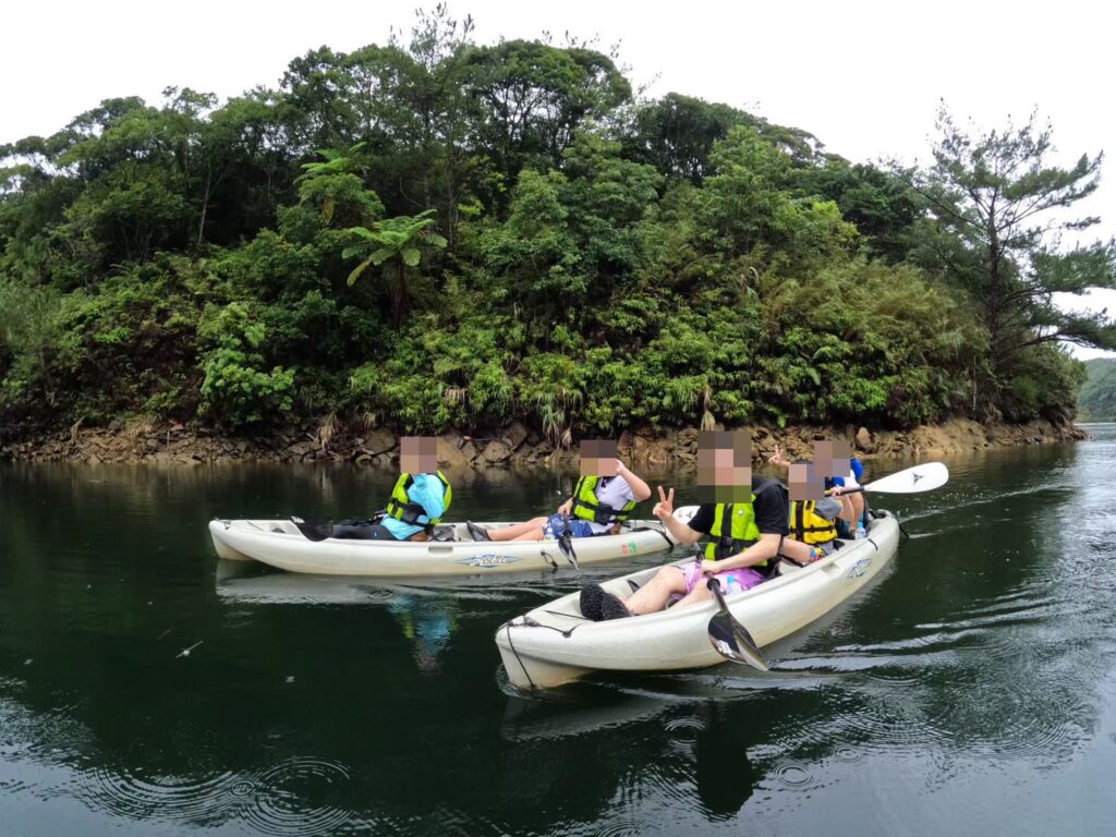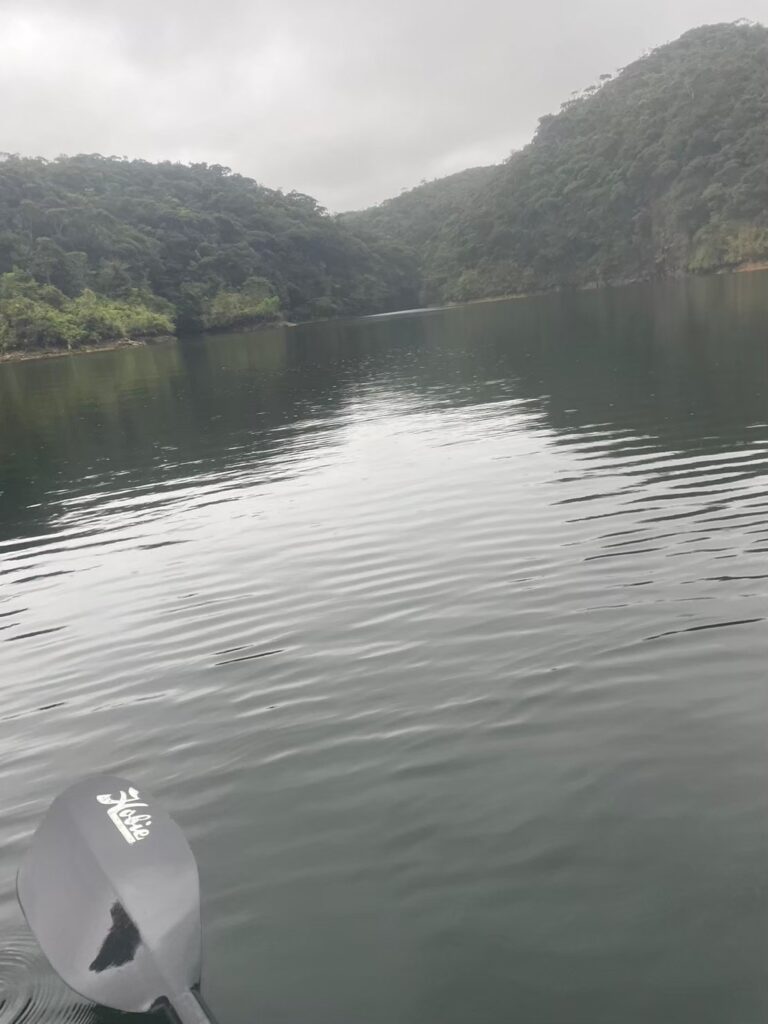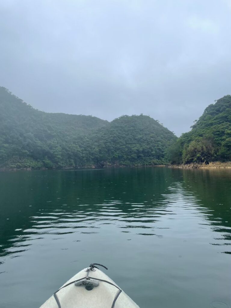 壮大な自然に囲まれた安波ダムの湖面にてカヤック体験